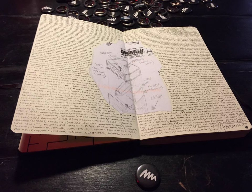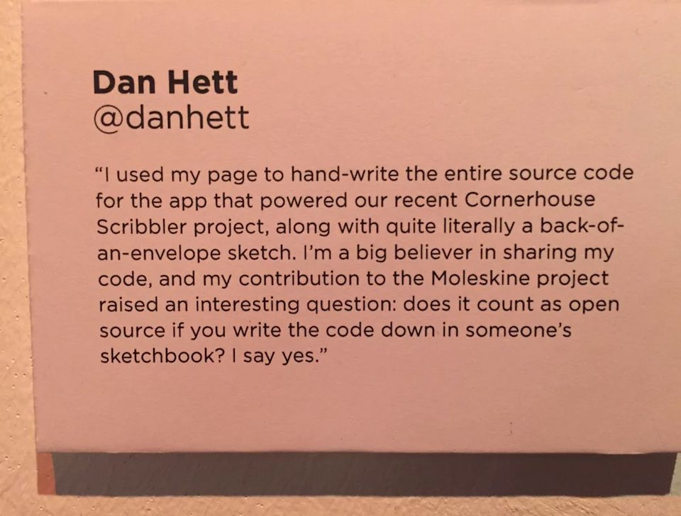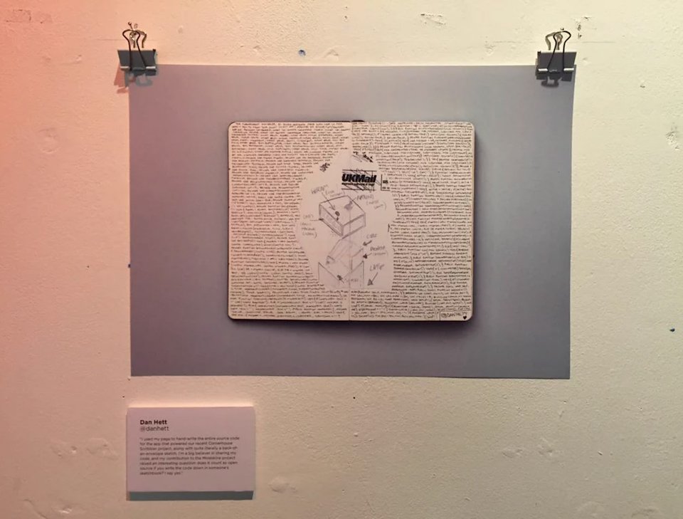 My entry was the entire source code of the Cornerhouse Scribbler application, along with one of the original back-of-an-envelope sketches. The idea was to ponder whether or not it counts as open-source if you write it down and stick it in a gallery. I vote yes.
