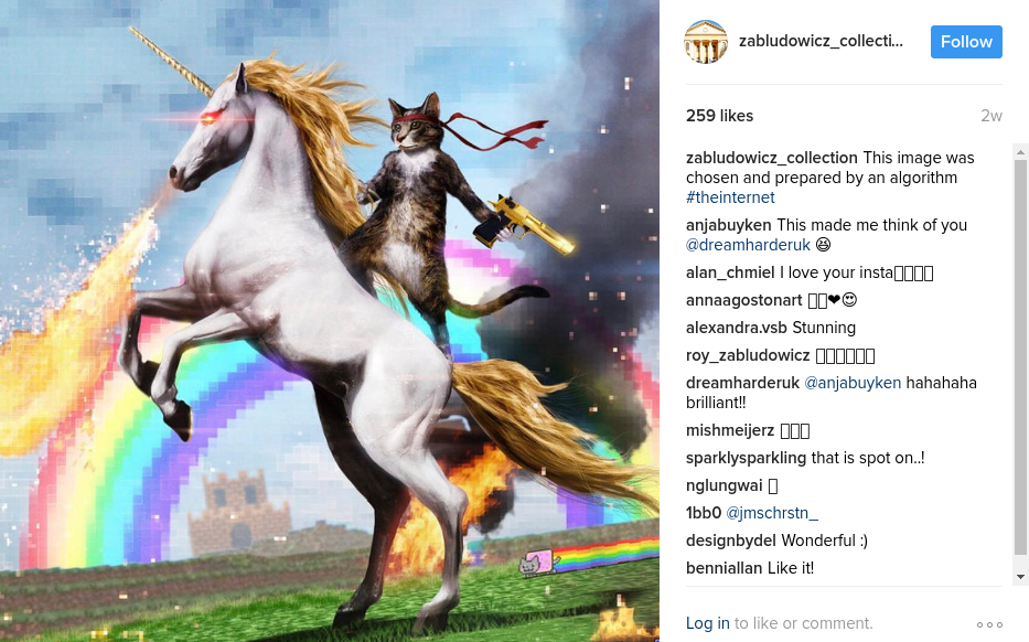 The algorithm makes a few passes at inferring meaning, and then selects many hundreds of images, from which a random number are selected based on relevancy, and interest points like faces being present, or text, etc. It then decides upon a posting time (typically during the day, but some at odd hours) and posts the image on our behalf, with no human curation, editing or selection.