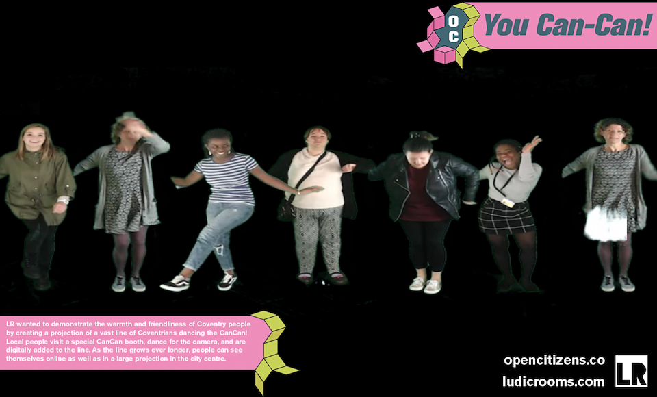 You Can-Can is an interactive installation built with Ludic Rooms for the Coventry Open Citizens event. It allows participants to dance the can-can against a green screen, which is then automatically cropped and prepared, and is added to an infinitely scrolling can-can display that’s viewable online, and was also projected at huge scales around the city.